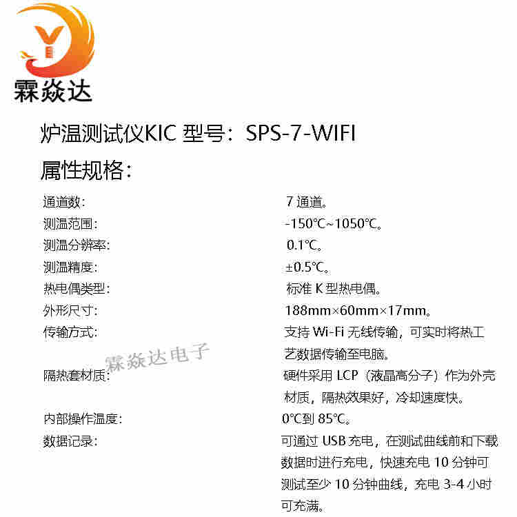 KIC SPS-7-WIFI爐溫測(cè)試儀,7通道同步測(cè)溫,范圍-150 - 1050℃,精度±0.5℃,分辨率0.1℃。支持Wi-Fi/USB傳輸,耐熱LCP材質(zhì),尺寸188×60×17mm,便攜設(shè)計(jì)。內(nèi)置鎳氫電池,單次測(cè)試?yán)m(xù)航,適配電子制造等熱加工場(chǎng)景,*記錄溫度數(shù)據(jù)。